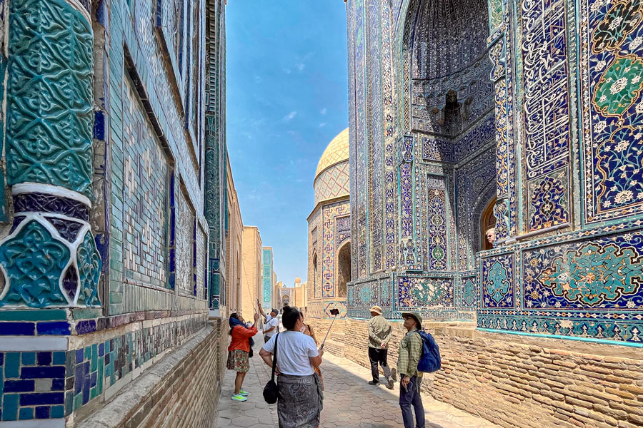 The tour continues to Shakhi-Zinda, an impressive burial complex dating mainly from the 15th century. Walk along its ceremonial pathway to admire the richly decorated blue-domed mausoleums.