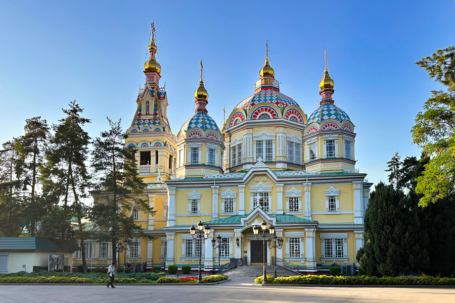 After breakfast, check out from the hotel and meet your guide and driver in the lobby to begin a guided city tour of Almaty. Enjoy a walk through the leafy paths of Panfilov Park and visit the iconic Zenkov Cathedral, an architectural masterpiece built entirely of wood without a single metal nail and one of the city’s oldest landmarks. Continue to the lively Green Bazaar, where colourful stalls, aromatic spices, and local delicacies offer an authentic glimpse into everyday Kazakh life.