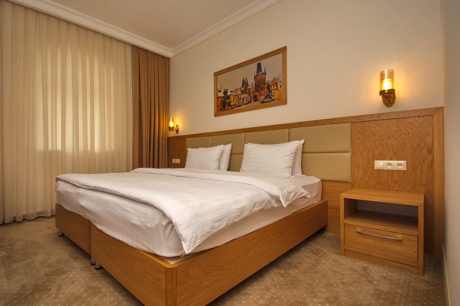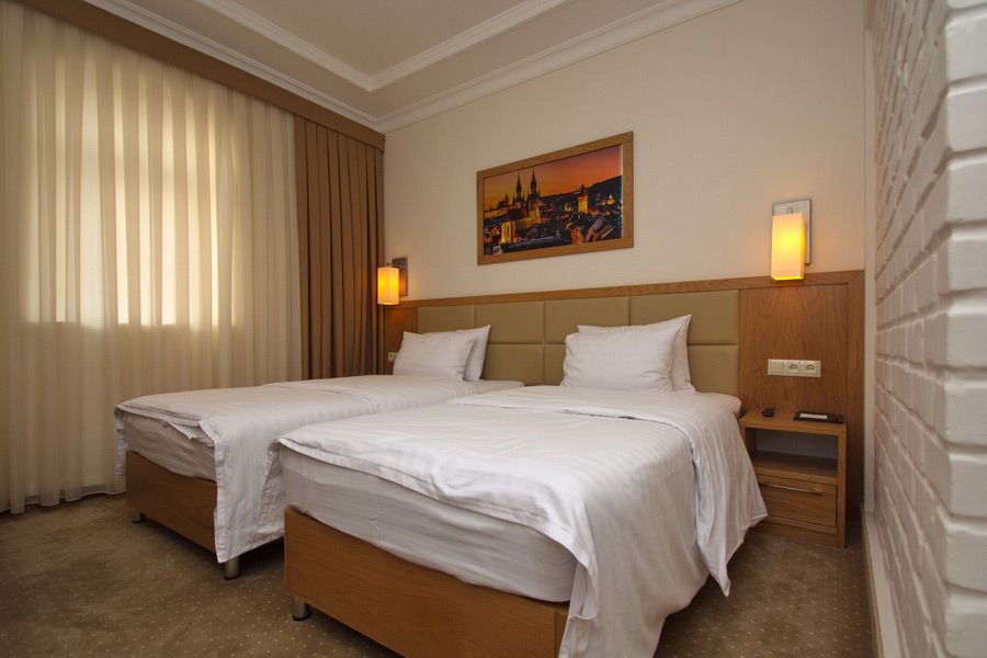 Номера гостиницы Прага отличаются простым лаконичным дизайном, в котором нет ничего лишнего. Они делятся на стандартные, полулюксы, люксы и семейные номера. Ванные комнаты светлые, чистые, и оборудованы душевыми кабинками. На территории отеля есть ресторан для завтраков на цокольном этаже, и уютная терраса со столиками на крыше, которая отлично подойдет для ужина в теплый летний вечер.