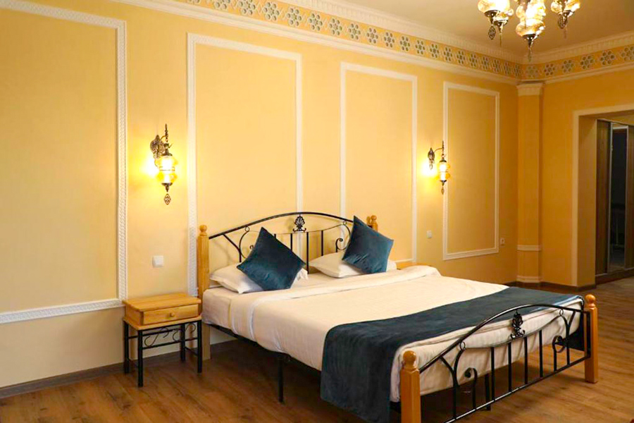 The terrace bar and three suite rooms with balconies and verandas have a spectacular view of the famous monuments. The small and peaceful courtyard of the hotel is arranged in Uzbek style and has a small garden with decorative plants. On the second floor of the restaurant is the open summer bar for 40 guests, from which a panoramic view of most of the city opens, and in the basement a winter bar is located.