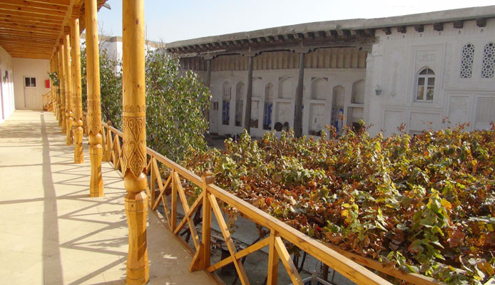 The house is constructed according to the climatic conditions of Bukhara. An ancient portal opens an into a cool hall. In a straight line an awning on high straight wooden carved columns and drawing room are located. The earlier house consisted of three courtyards. Huge gates were constructed for the entrance of horses and elephants. Bek had 2 Indian elephants and 8 horses.